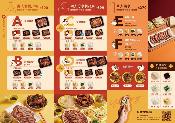 創立30餘年,店家堅持對烤鴨的熱情與專業,手工烤製,並以獨特配方打造出外皮酥脆、肉質鮮嫩的烤鴨,保留了傳統的經典風味,還勇於注入年輕時尚元素,重新打造二代店全新品牌金炙鴨鴨,鹽酥和韓式雙口味,顛覆了烤鴨經典美食印象,在新竹美食圈掀起風潮。