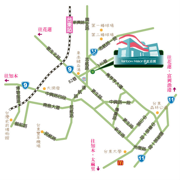 高雄.屏東 →台東 (台九省道) → 南迴公路 → 青海路 → 中興路 → 左轉連航路(經過日光大橋) → 左轉志航路一段 → 右轉146巷 → 彩虹莊園