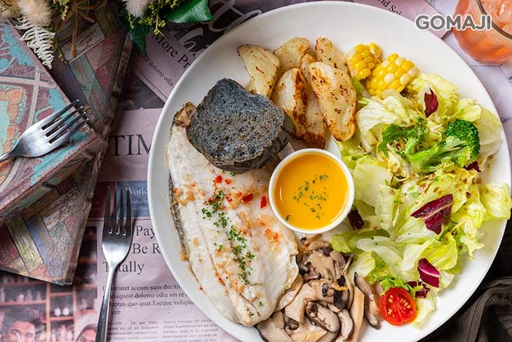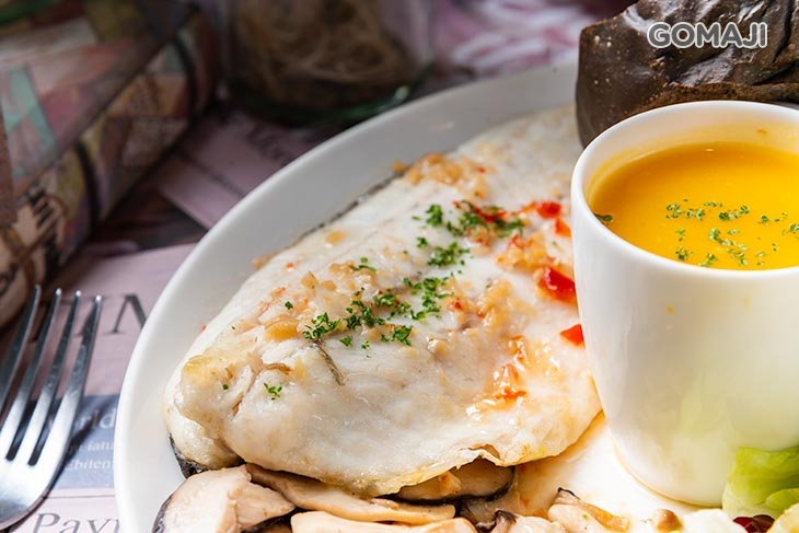野食。魚菲力(鱸魚菲力+炒菇+綜合生菜+薯塊+杯湯)
