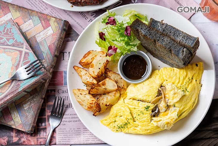 鮮蔬野菇歐姆蛋(在也切不完的菇+花椰菜+起司+蛋液+薯塊+綜合生菜+今日例湯+純牛奶竹炭吐司)