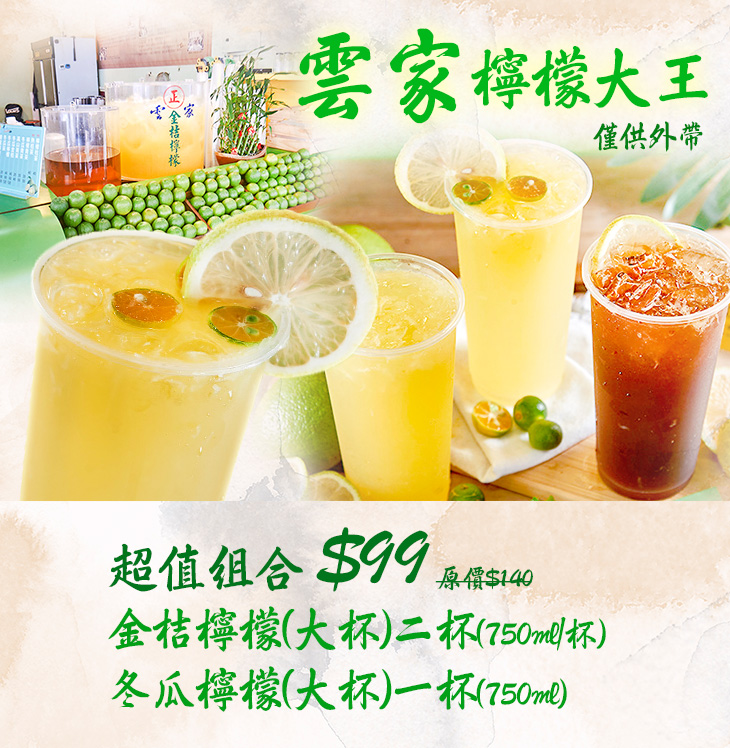 走過半個世紀的老字號-雲家檸檬大王,相信不少高雄人肯定都喝過吧~新鮮金桔與酸溜溜的檸檬,完美結合,再搭配自家熬煮的砂糖漿,風味獨特,溫潤順口;「常喝一杯檸檬汁 還你青春二十年」是雲老先生的經營理念,以標語的廣宣方式貼在飲品的外觀上,來提醒顧客檸檬對身體健康的益處多多, 並堅持每天使用新鮮的金桔、檸檬現榨成濃郁原汁,來做為調飲的基底,講究最傳統的原始美味,且後續也持續增加其他檸檬飲品相關選項,口味變化多元,讓您可以時常更換口味,新鮮不無趣~~~