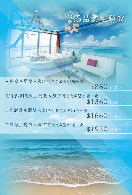 以簡約素雅為主要的佈置風格,突顯出主人獨有的高貴品味,走進85品雲裡彌漫著夢幻、浪漫的情調 ;充滿著陽光溫暖的溫度,熱情無限的高雄,讓每位入宿品雲的貴賓都能體驗不同的感受。