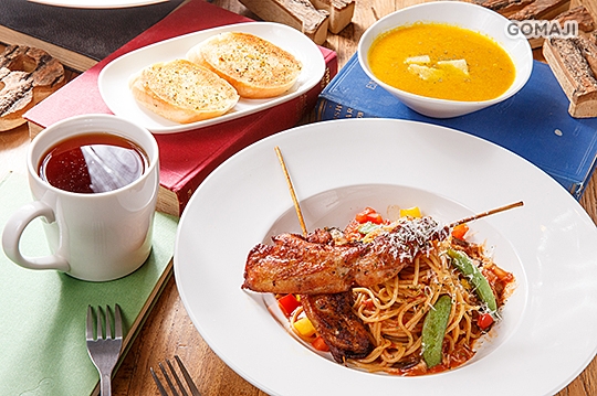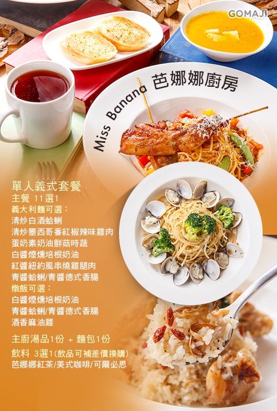 主餐(義大利麵可選:清炒白酒蛤蜊/清炒墨西哥番紅椒辣味雞肉/蛋奶素奶油鮮菇時蔬/白醬煙燻培根奶油/紅醬紐約風串燒雞腿肉/青醬蛤蜊/青醬德式香腸)/(燉飯可選:白醬煙燻培根奶油/青醬蛤蜊/青醬德式香腸/酒香麻油雞)11選1 + 主廚湯品1份 + 麵包1份 + 飲料:芭娜娜紅茶/美式咖啡/可爾必思 3選1(飲品可補差價換購)