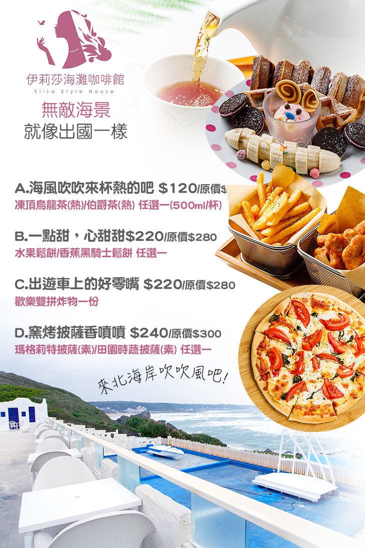 「伊莉莎」意指"優雅的女性"和"蝴蝶",是美麗和自由的代表,五彩斑斕、絢麗多彩。象徵幸福美好,配色使用粉紅色,而在色彩心理學分析上有著不同的意義,它可以喚起趣味和年輕的感受,較淺的色調則帶著更浪漫和細膩的感覺。獨特裝潢設計及地中海風格,新的領導執行團隊,翻新強化餐飲品質並提升優質服務以及用心打造浪漫舒適環境,讓您在北海岸之旅能夠留下美好的體驗和回憶。