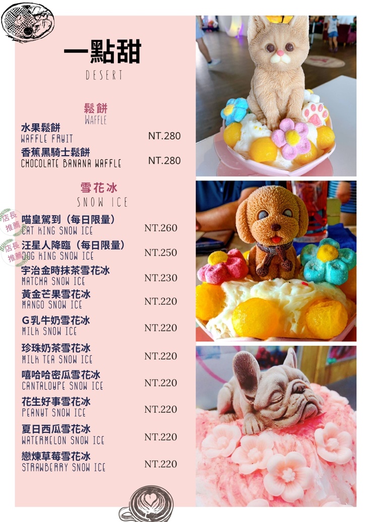 不只有貓咪湯磚,店裡還有精緻又美味的雪花冰可以點唷!以大顆飽滿的新鮮草莓點亮視覺感官,一顆顆擺放在牛奶雪花冰旁邊,酸甜的濃郁感,搭配可愛的汪星人冰磚,根本就無敵了呀 ~ 不只視覺上看著可愛,香香甜甜的口感更讓人覺得幸福無比,不分年紀一定都會很喜歡!