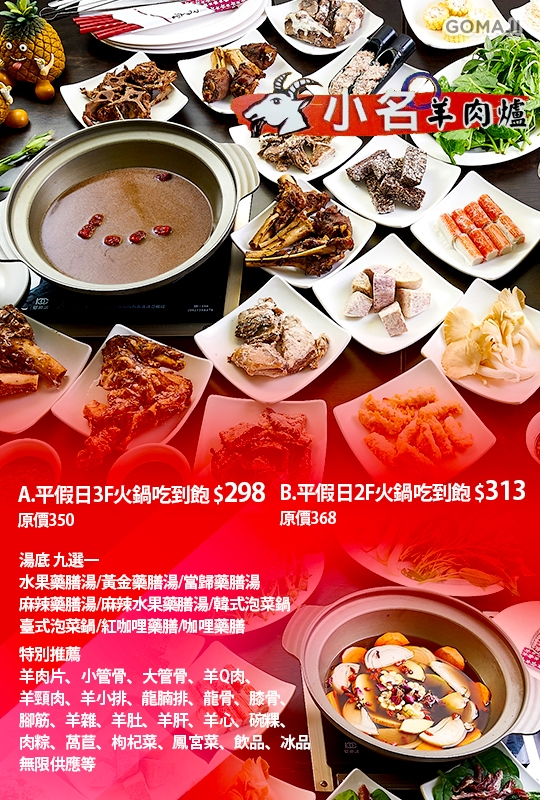 水果藥膳湯/黃金藥膳湯/當歸藥膳湯/麻辣藥膳湯/麻辣水果藥膳湯/韓式泡菜鍋/臺式泡菜鍋/紅咖哩藥膳/咖哩藥膳 九選一,特別推薦:羊肉片、小管骨、大管骨、羊Q肉、羊頸肉、羊小排、龍腩排、龍骨、膝骨、腳筋、羊雜、羊肚、羊肝、羊心、碗粿、肉粽、萵苣、枸杞菜、鳳宮菜、飲品、冰品無限供應等