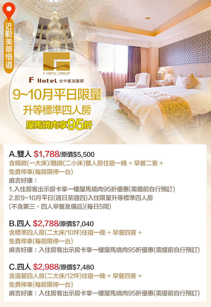 ★ A方案9~10月平日(週日至週四)限量升等標準四人房,第三、四人可免費入住(不含早餐及備品)。