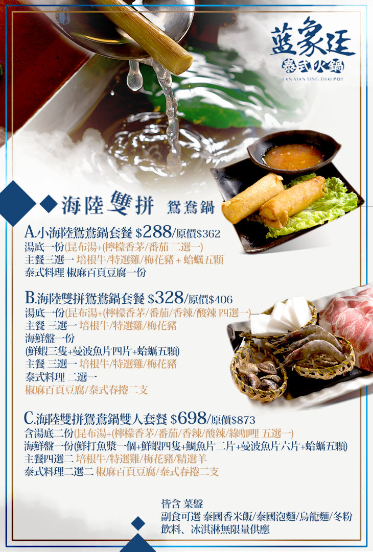 湯底二份(每份均含昆布湯+(檸檬香茅/番茄/香辣/酸辣/綠咖哩 五選一)) + 海鮮盤一份(鮮打魚漿一個+鮮蝦四隻+鯛魚片二片+曼波魚片六片+蛤蠣五顆) + 主餐:培根牛/特選雞/梅花豬/精選羊 四選二 + 泰式料理:椒麻百頁豆腐/泰式春捲二支 二選二 + 菜盤二份(綜合蔬菜盤) + 副食:泰國香米飯/泰國泡麵/烏龍麵/冬粉 四選二 + 飲料、冰淇淋無限量供應