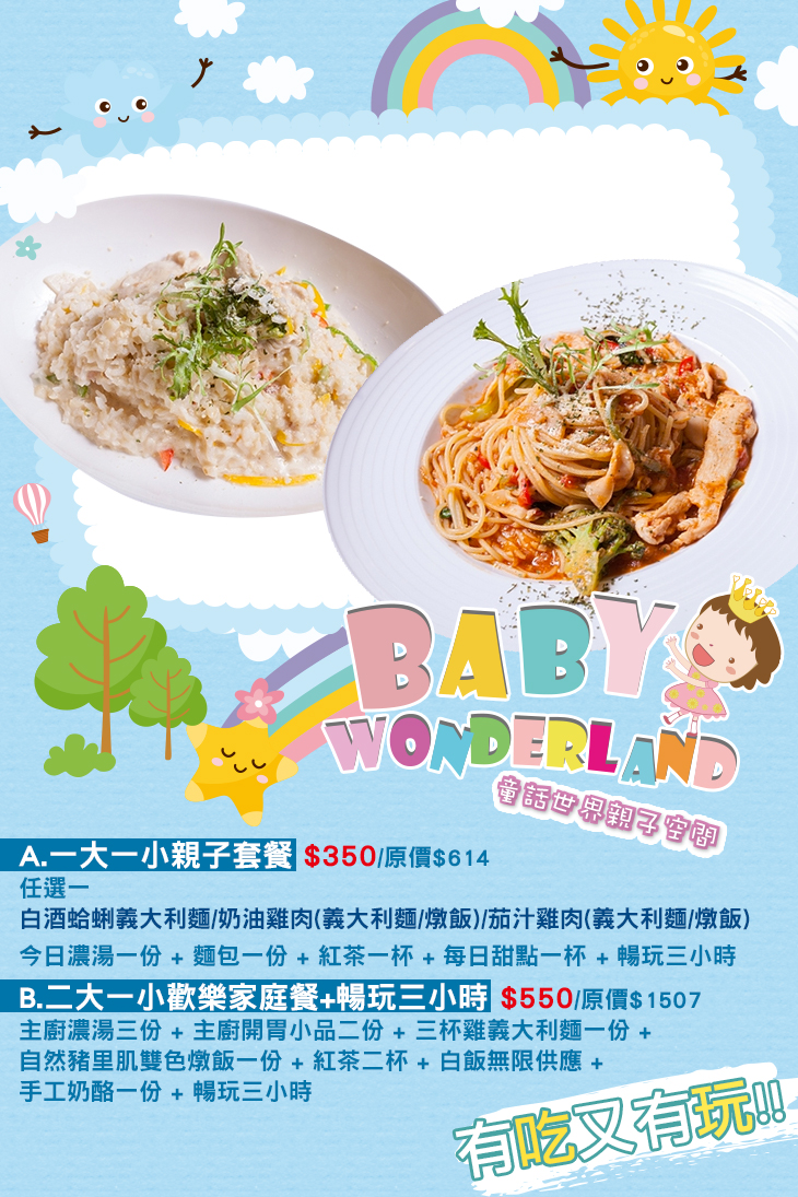 現在的父母越來越年輕化,帶孩子上餐廳的比例越來越高,加上現在的父母越來越重視孩子的成長教育,體恤家長們的辛苦及珍惜每一刻與寶貝們的相處時光,打造了這座大朋友及小朋友的夢幻園地。近捷運永安市場站、四號公園安樂路口,提供一個親切的玩樂餐飲空間,讓小朋友玩得愉快,大人也能吃得安心的友善餐飲環境!