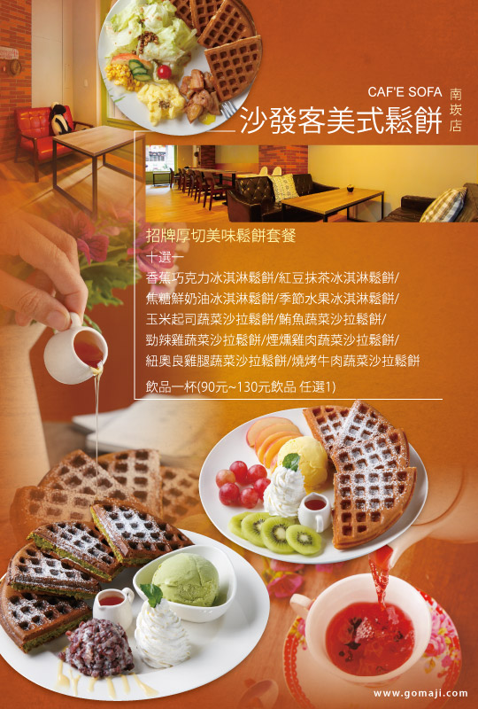 桃園最頂級的鬆餅饗宴!【沙發客美式鬆餅】以美式鬆餅、早午餐、咖啡茶飲、現打果汁為麻吉獻上豐富美味選擇,精心設計帶有北歐鄉村元素的空間呈現,更是讓來過的知名部落客無不真心推薦!歡慶桃園總店、南崁店同時合作,招牌厚切美味鬆餅套餐限時249元!香蕉巧克力冰淇淋、紅豆抹茶冰淇淋、煙燻雞肉蔬菜沙拉、紐奧良雞腿蔬菜沙拉等口味 10選1,搭配新鮮特調的飲品,獨自沉浸在一個人甜點時光也是很幸福的!