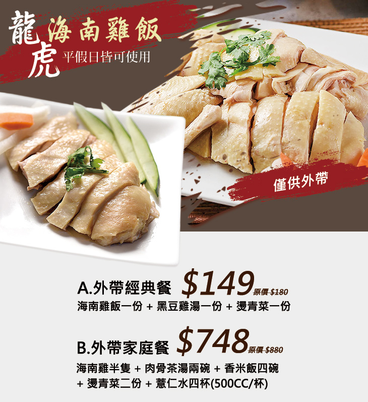 A.外帶經典餐〈海南雞飯一份 + 黑豆雞湯一份 + 燙青菜一份〉