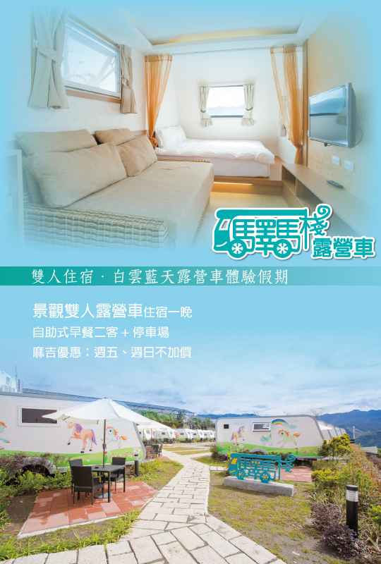 來到霧上桃源,當然要體驗與自然合而為一的感受,露營太克難,盥洗不便又怕蚊蟲騷擾,住民宿又缺少了親近大自然的感覺,現在您有了更好的選擇!別看露營車小小一台,內部設備可是一應俱全!雙人獨立筒加大床墊、電煮熱水壺、液晶電視、乾溼分離衛浴設備等通通有,露營踏青不必犧牲便利!