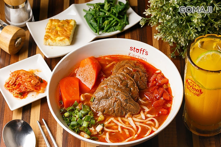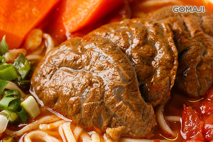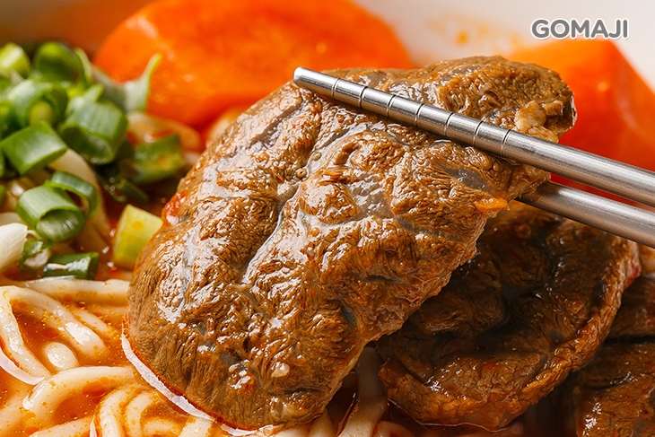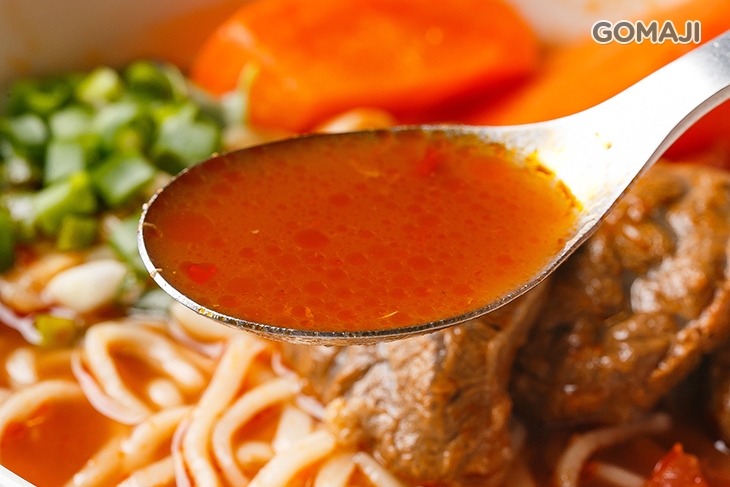 嚴選牛肉、牛筋參半的新鮮牛肉,搭配自家獨門研發滷汁,每日費時烹煮而成,焦糖般的色澤,在日光燈的照耀下,閃亮迷人,輕淺嚐一口紅燒湯底,味濃汁鮮,蕃茄的精華全集聚裡頭,搭配咕溜滑順的麵條與蔥末提味,魅力果真不同凡響。