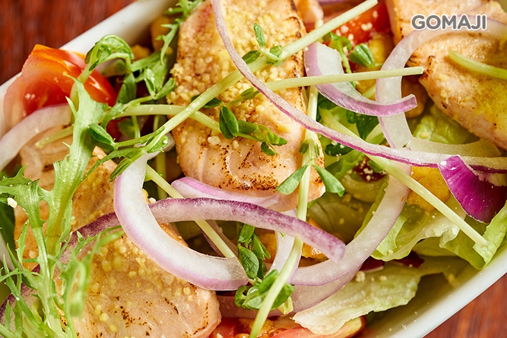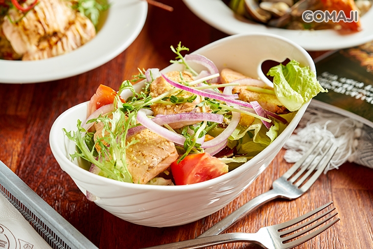 一大盤鮮豔色彩的時蔬沙拉,清脆多汁的新鮮風味,搭配炙燒鮭魚,鹹香柔嫩的氣息與甜脆沙拉濃淡相宜,極為開脾爽胃!