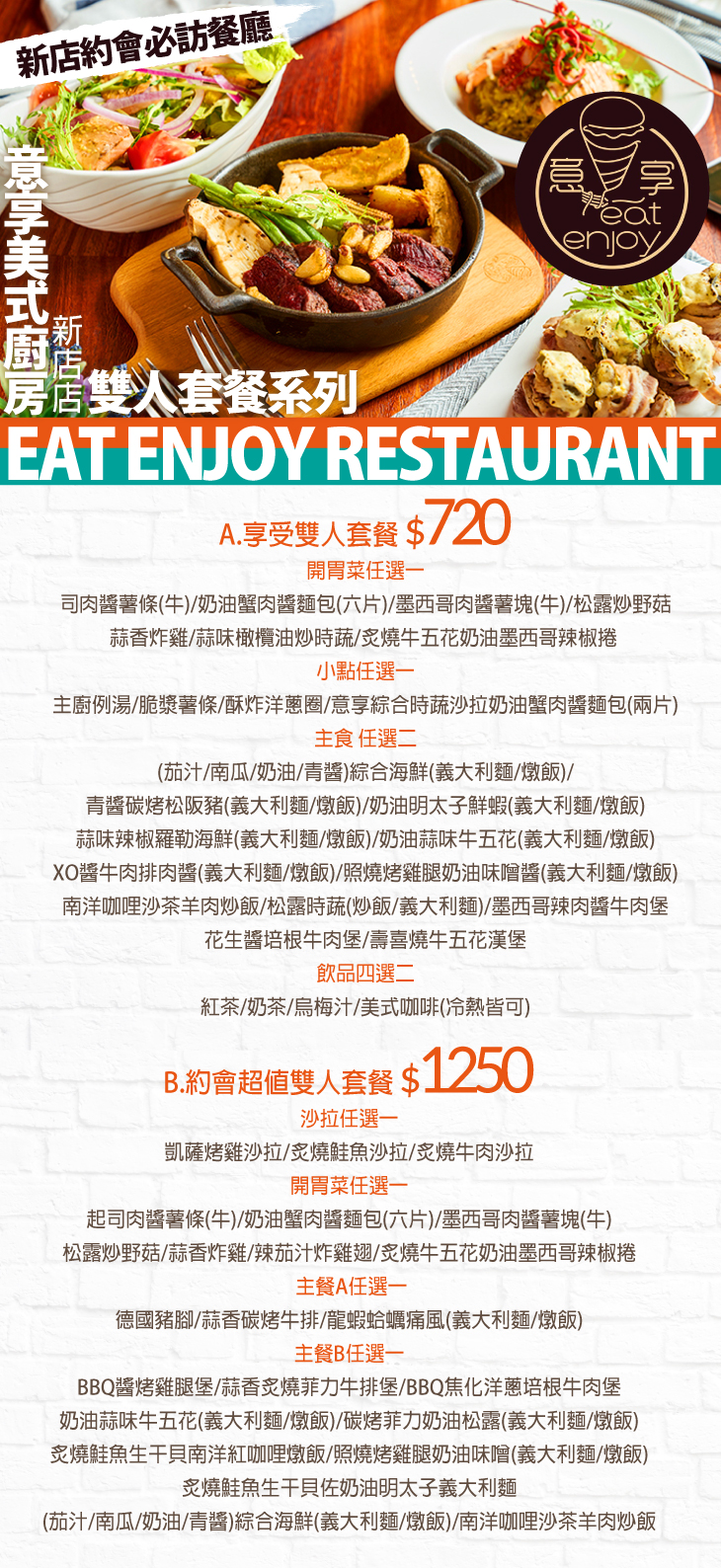 「eat enjoy 意享美式廚房」創店至今已有數年,提供多樣豐富的餐點選擇,義大利麵、燉飯、披薩、漢堡、早午餐,皆由掌廚多年的主廚獨家研究開發,不使用加工半成品,這是eat enjoy對於料理的堅持與熱誠,並針對不同的季節推出當季水果限定法式甜點,帶給顧客更豐富的味蕾體驗!「EAT ENJOY」顧名思義,希望顧客們能夠恣意地享受美食,對於想單純享受午後悠閒時光的顧客,這裡絕對是最佳去處,同時也是寵物友善餐廳,歡迎帶毛小孩的麻吉一起前往享樂喔!