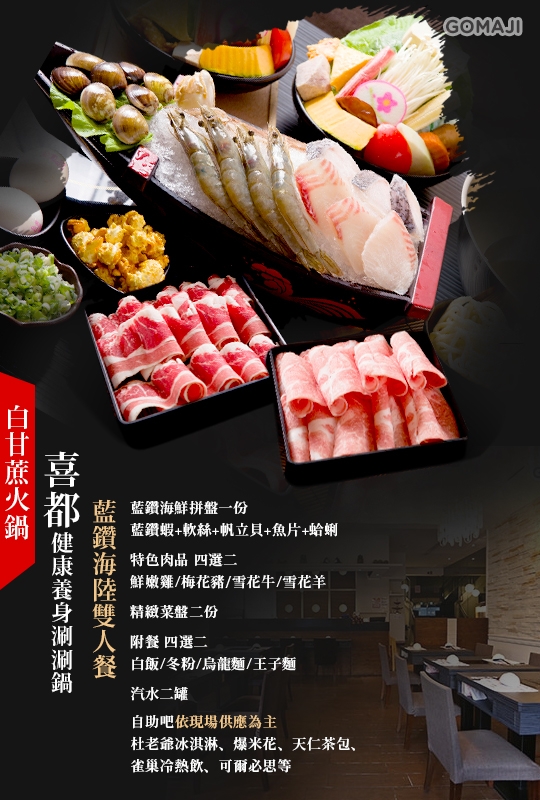 位於新北市永和區永貞路的喜都健康養身涮涮鍋(白甘蔗火鍋),專賣新鮮美味的鍋物,主打清爽、不油膩的風味,加上特色湯頭更是一絕!店家嚴選新鮮食材,甜潤海鮮X極鮮肉品,包山包海的海陸雙享受絕對能征服你的味蕾!超值鮮美的組合錯過絕對搥心肝!