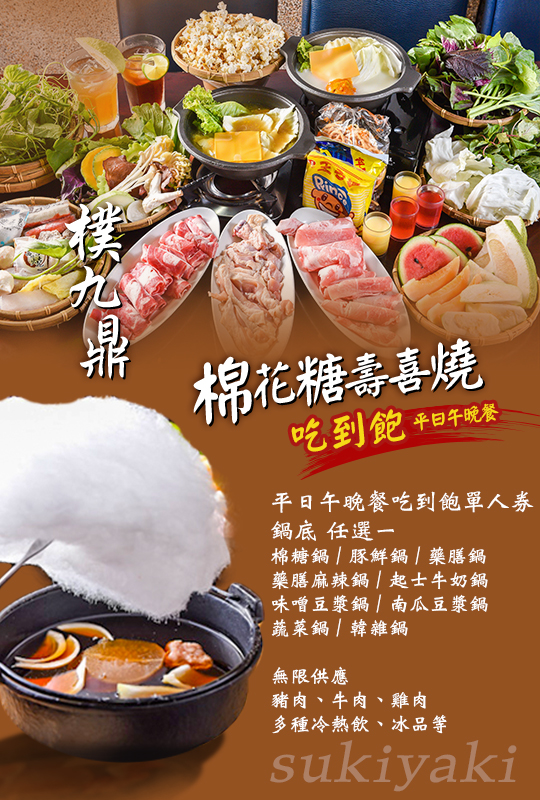 鍋底:棉糖鍋/豚鮮鍋/藥膳鍋/藥膳麻辣鍋/起士牛奶鍋/味噌豆漿鍋/南瓜豆漿鍋/蔬菜鍋/韓雜鍋 任選一 + 無限供應:豬肉、牛肉、雞肉、多種冷熱飲、冰品等