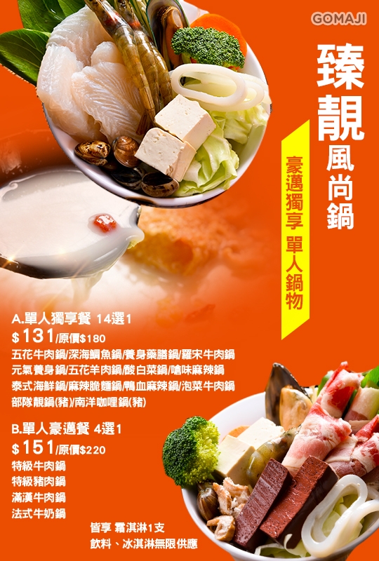 五花牛肉鍋/深海鯛魚鍋/養身藥膳鍋/羅宋牛肉鍋/元氣養身鍋/五花羊肉鍋/酸白菜鍋/嗆味麻辣鍋/泰式海鮮鍋/麻辣脆麵鍋/鴨血麻辣鍋/泡菜牛肉鍋/部隊靚鍋(豬)/南洋咖哩鍋(豬) 14選1 + 霜淇淋1支 + 飲料、冰淇淋無限供應