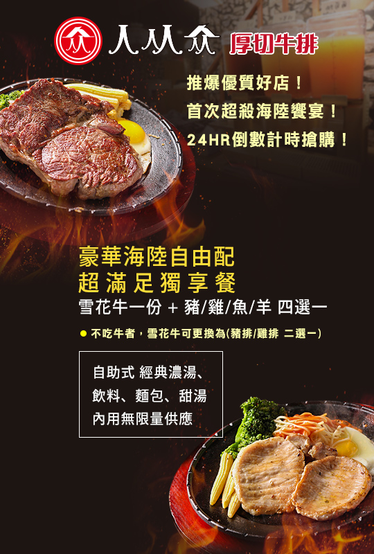 雪花牛一份 + 豬/雞/魚/羊 四選一 + 自助式:經典濃湯、飲料、麵包、甜湯內用無限量供應