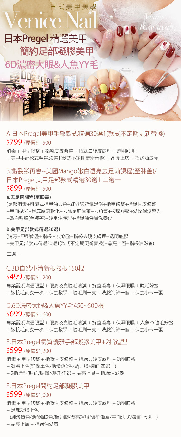 A.日本Pregel美甲手部款式精選30選1(款式不定期更新替換) / B.龜裂腳再會~美國Mango嫩白透亮去足繭課程(至膝蓋)/日本Pregel美甲足部款式精選30選1 二選一 / C.3D自然小清新根接根150根 / D.6D濃密大眼&人魚YY毛450~500根 / E.日本Pregel氣質優雅手部凝膠美甲+2指造型 / F.日本Pregel簡約足部凝膠美甲