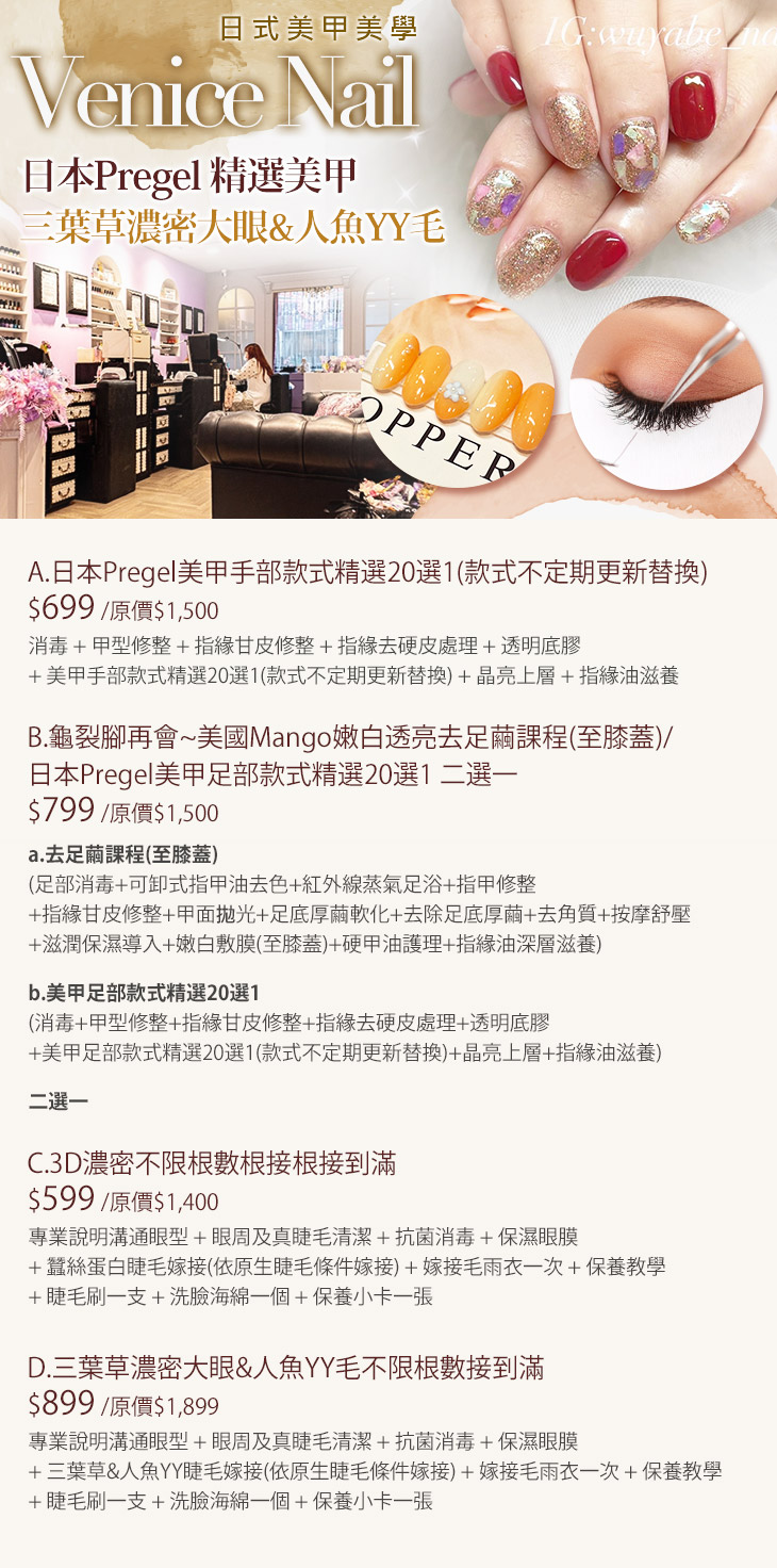 A.日本Pregel美甲手部款式精選20選1(款式不定期更新替換) / B.龜裂腳再會~美國Mango嫩白透亮去足繭課程(至膝蓋)/日本Pregel美甲足部款式精選20選1 二選一 / C.3D濃密不限根數根接根接到滿 / D.三葉草濃密大眼&人魚YY毛不限根數接到滿