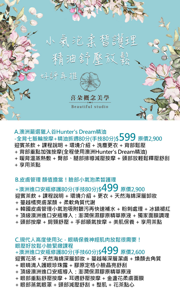 A.澳洲嚴選獵人谷Hunter's Dream精油-全背七脈輪按摩+精油抓週80分(手技80分) / B.皮膚管理 顏值擔當!臉部小氣泡柔皙護理+澳洲進口安瓶修護80分(手技80分) / C.現代人高度使用3c,眼睛保養神經肌肉放鬆很需要!眼壓好放鬆小臉緊緻課程+澳洲進口安瓶修護80分(手技60分)