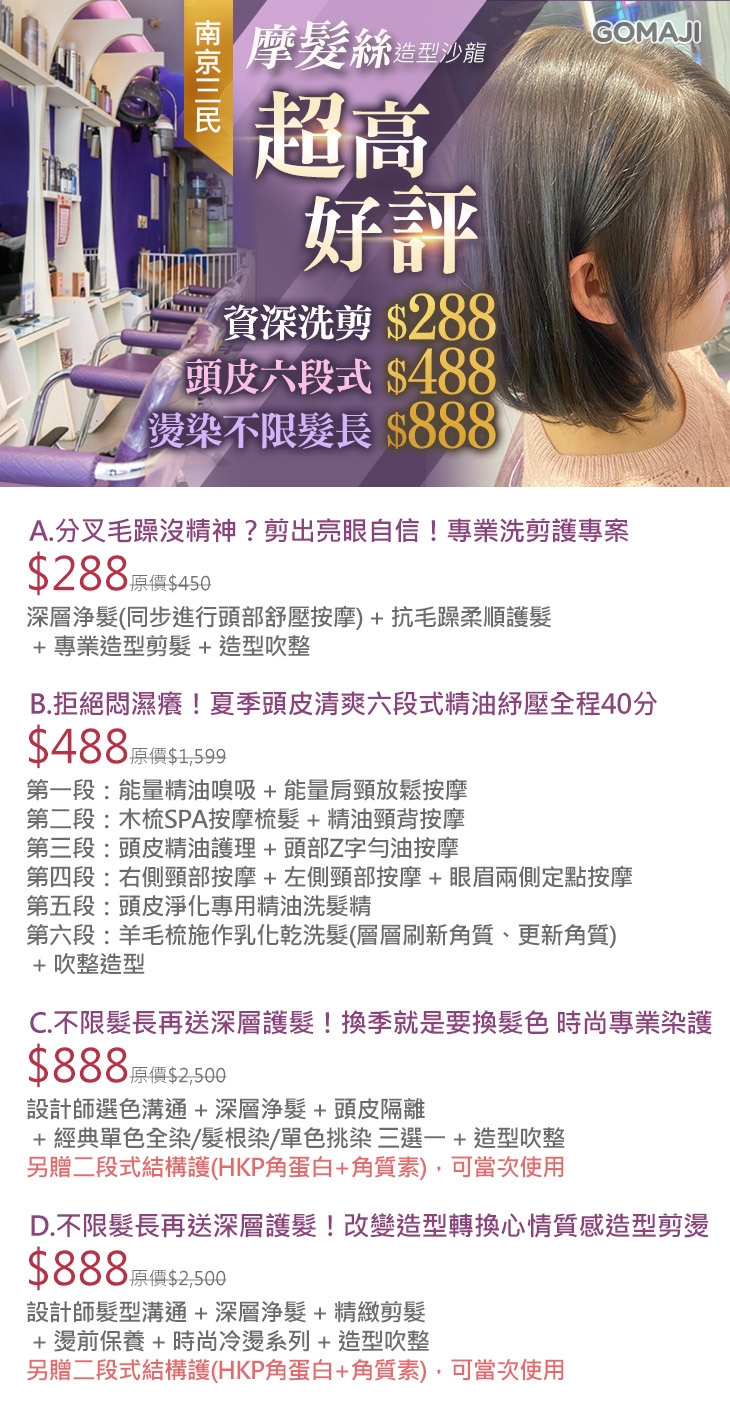 A.分叉毛躁沒精神?剪出亮眼自信!專業洗剪護專案 / B.拒絕悶濕癢!夏季頭皮清爽六段式精油紓壓全程40分 / C.不限髮長再送深層護髮!換季就是要換髮色-時尚專業染護 / D.不限髮長再送深層護髮!改變造型轉換心情-質感造型剪燙