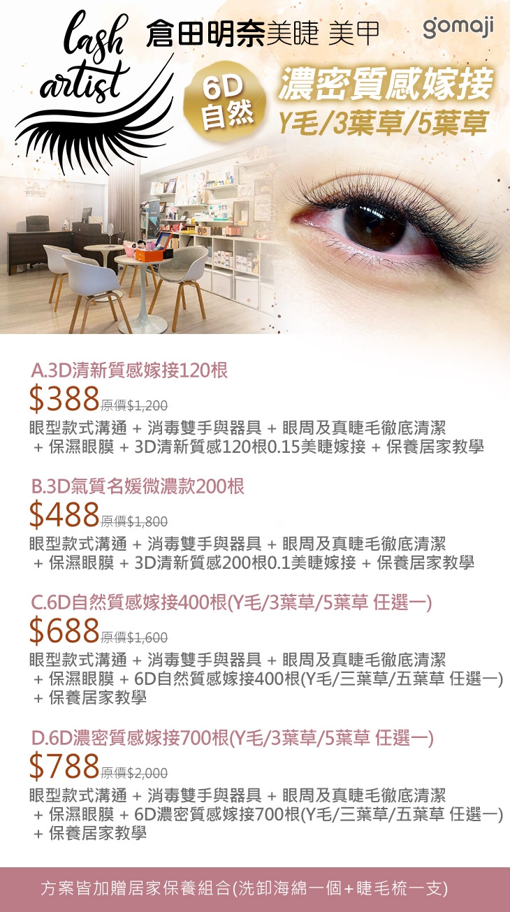 A.3D清新質感嫁接120根 / B.3D氣質名媛微濃款200根 / C.6D自然質感嫁接400根(Y毛/3葉草/5葉草 任選一) / D.6D濃密質感嫁接700根(Y毛/3葉草5葉草 任選一)