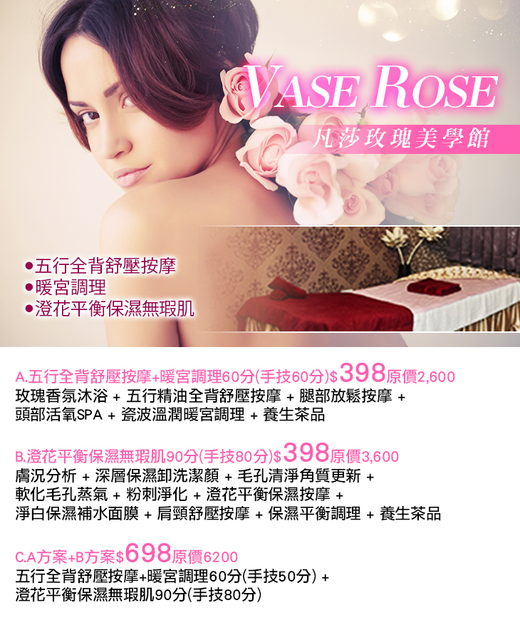 A.五行全背舒壓按摩+暖宮調理60分(手技60分) / B.澄花平衡保濕無瑕肌90分(手技80分) / C.A方案+B方案