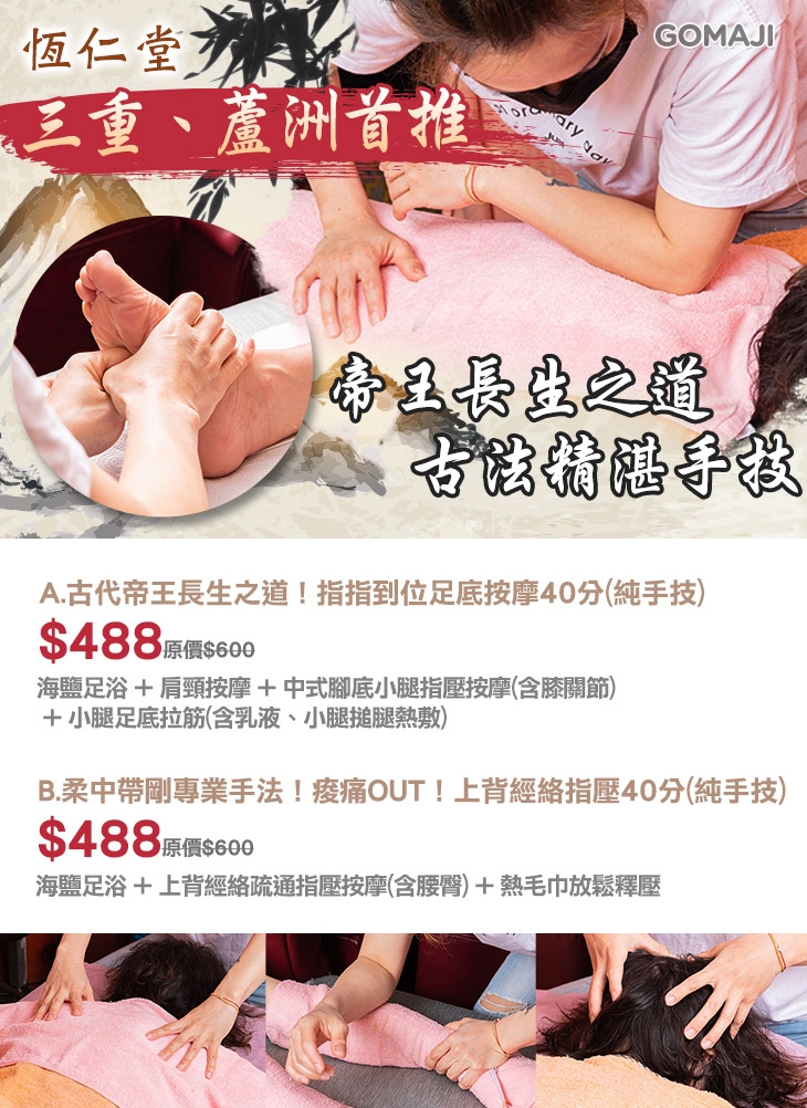 在地經營13年,口碑極佳,得到全國百大按摩名店!按摩師傳承古法精湛手技,對於人體穴道的拿捏,手勁的功力,在輕重收放之間,舒緩您身體所有的疲勞與壓力,從手技到服務上皆能感受到店家的用心。當您感到身心疲倦的時候,來到恆仁堂幫您好好放鬆,注入滿滿活力與能量吧!多元選擇的方案,更是能依照您的需求打造最適合的課程,讓按摩可以達到最有效的舒壓成果!生活再忙,也不要忘了找時間好好犒賞自己,現在就快預約前往吧!