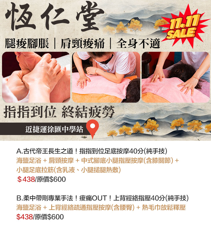 在地經營13年,口碑極佳,得到全國百大按摩名店!按摩師傳承古法精湛手技,對於人體穴道的拿捏,手勁的功力,在輕重收放之間,舒緩您身體所有的疲勞與壓力,從手技到服務上皆能感受到店家的用心。當您感到身心疲倦的時候,來到恆仁堂幫您好好放鬆,注入滿滿活力與能量吧!多元選擇的方案,更是能依照您的需求打造最適合的課程,讓按摩可以達到最有效的舒壓成果!生活再忙,也不要忘了找時間好好犒賞自己,現在就快預約前往吧!