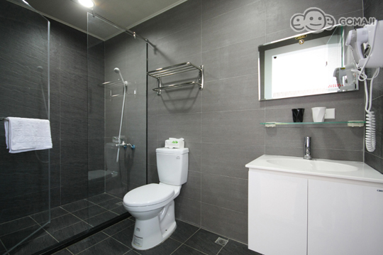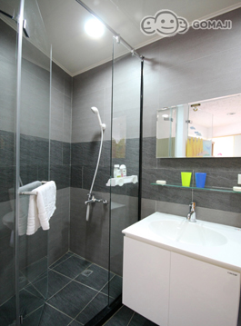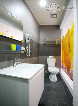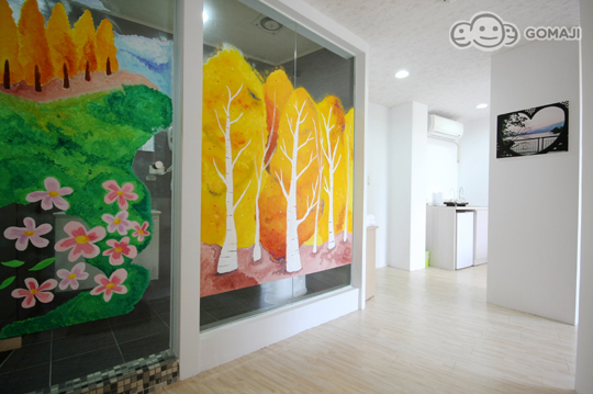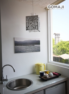 獨立套房中有小吧檯可自由運用,入浴前會看到充滿童趣的彩繪牆。