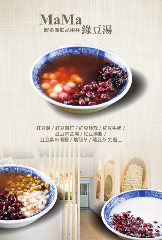 【MaMa綠豆湯】位於西區大墩六街上,嚴選萬丹紅豆、毛綠豆、阿里山野生愛玉籽、養樂多鮮奶、台糖冰糖蔗糖等,從始至終堅持古法熬製,現點現盛送上一碗碗新鮮天然、健康養生的手作甜湯或飲料!現在只要89元就能享用暖冬熱飲品兩杯!紅豆湯、紅豆薏仁、紅豆珍珠、紅豆牛奶、紅豆綜合湯、紅豆湯圓、紅豆紫米湯圓、燒仙草、黑豆茶,麻吉想吃哪兩碗? 紅豆薏仁 紅豆珍珠 紅豆牛奶 紅豆綜合湯 紅豆紫米湯圓