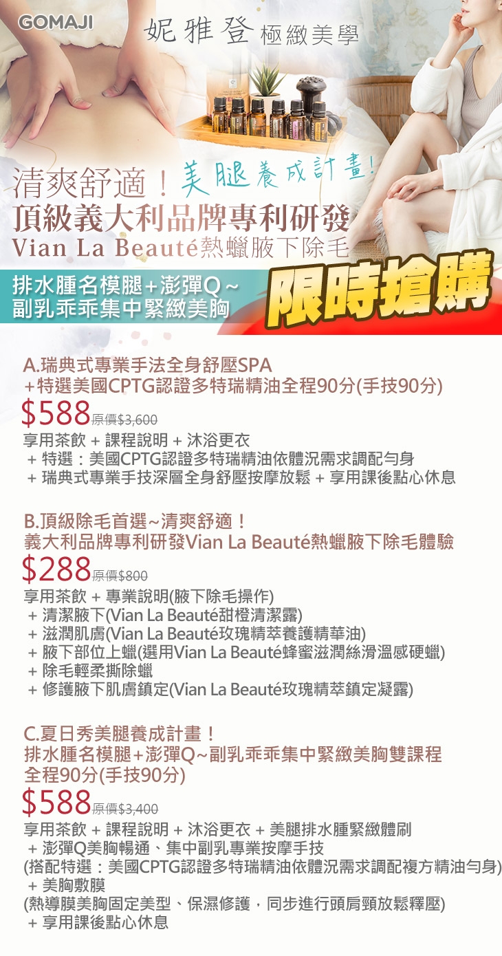 A.瑞典式專業手法全身舒壓SPA+特選美國CPTG認證多特瑞精油全程90分(手技90分) / B.頂級除毛首選~清爽舒適!義大利品牌專利研發Vian La Beauté熱蠟腋下除毛體驗 / C.夏日秀美腿養成計畫!排水腫名模腿+澎彈Q~副乳乖乖集中緊緻美胸雙課程全程90分(手技90分)