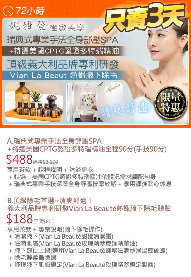 A.瑞典式專業手法全身舒壓SPA+特選美國CPTG認證多特瑞精油全程90分(手技90分) / B.頂級除毛首選~清爽舒適!義大利品牌專利研發Vian La Beauté熱蠟腋下除毛體驗