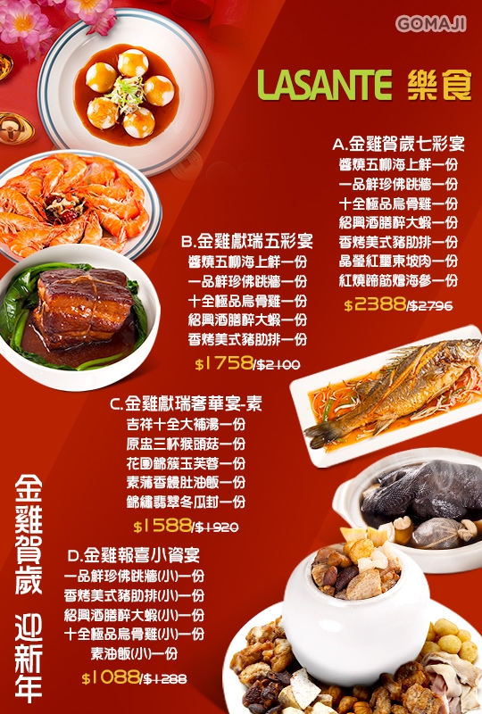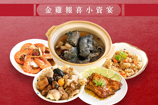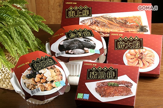 一品鮮珍佛跳牆(小)一份 + 香烤美式豬肋排(小)一份 + 紹興酒膳醉大蝦(小)一份 + 十全極品烏骨雞(小)一份 + 素油飯(小)一份