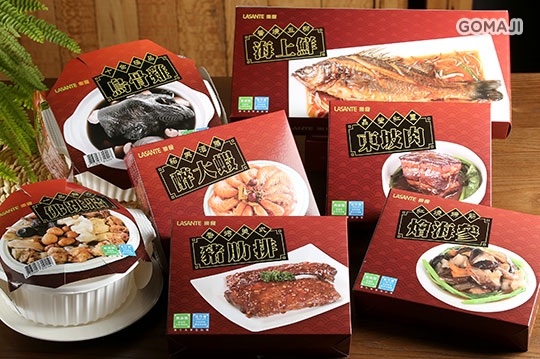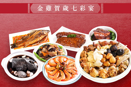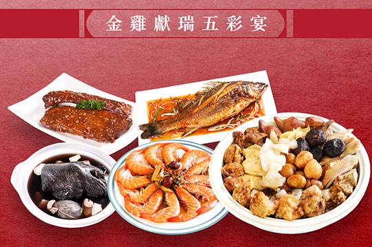 醬燒五柳海上鮮一份 + 一品鮮珍佛跳牆一份 + 十全極品烏骨雞一份 + 紹興酒膳醉大蝦一份 + 香烤美式豬肋排一份 + 晶瑩紅璽東坡肉一份 + 紅燒蹄筋燴海參一份