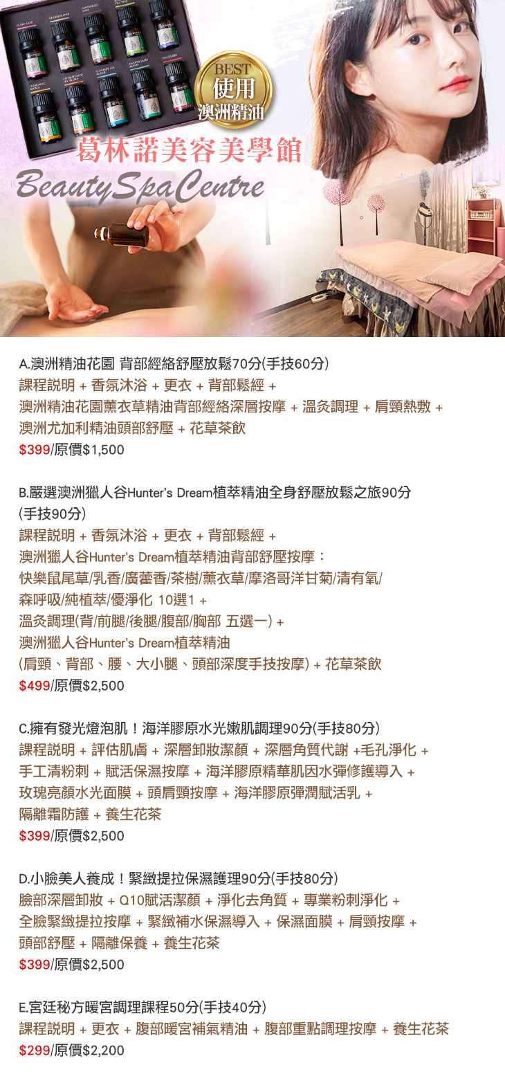 A.澳洲精油花園 背部經絡舒壓放鬆70分(手技60分) / B.嚴選澳洲獵人谷Hunter's Dream植萃精油全身舒壓放鬆之旅90分(手技90分) / C.擁有發光燈泡肌!海洋膠原水光嫩肌調理90分(手技80分) / D.小臉美人養成!緊緻提拉保濕護理90分(手技80分) / E.宮廷秘方暖宮調理課程50分(手技40分)