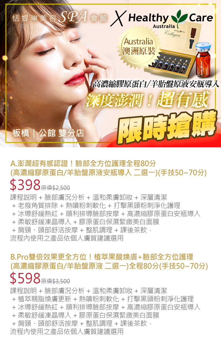 A.澎潤超有感認證!臉部全方位護理全程80分(高濃縮膠原蛋白/羊胎盤原液安瓶導入 二選一)(手技50~70分) / B.Pro雙倍效果更全方位!植萃果酸煥膚+臉部全方位護理(高濃縮膠原蛋白/羊胎盤原液 二選一)全程80分(手技50~70分)