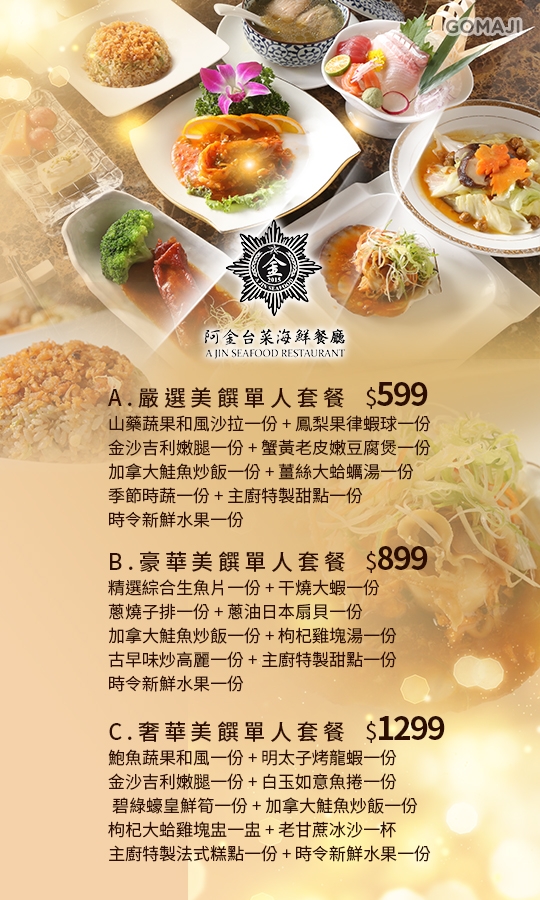 店家所提供的海鮮皆為當日新鮮魚獲產地直送,經典法式甜點則有甜點冠軍師傅專門製作,傳統中菜、日式料理,皆各有專業廚師掌勺,確保送上你舌尖的每一道料理、每一口味道,皆是阿金台菜海鮮餐廳的品質保證,料鮮味美,配上頂級水果與甜點,讓你的一餐不只是填飽肚子,而是味蕾的極上饗宴。