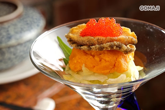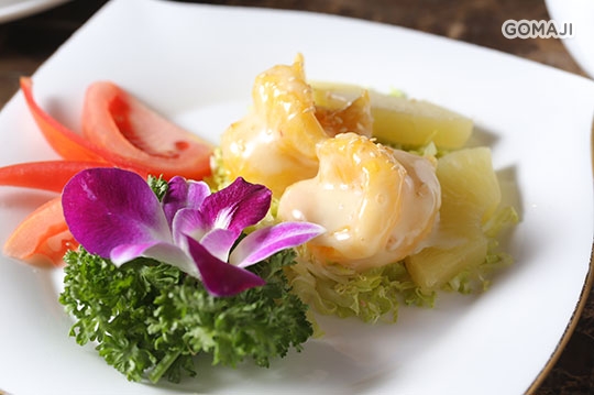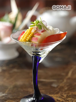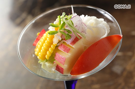 輕爽帶點微酸滋味的和風醬,淋在裝飾繽紛華美的水果沙拉上,輕脆的口感讓人更感到開胃,以愉悅的心情期待接下來的美食之旅。