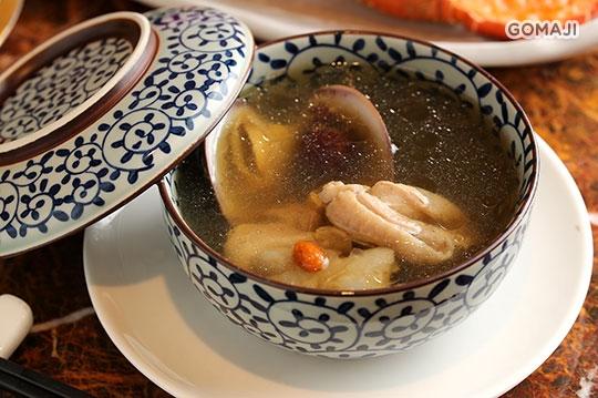 清澈鮮甜的雞湯,經過長時間的熬煮,雞肉的精華與蛤蠣的濃郁海味,將湯的奧妙滋味提升更高一層。