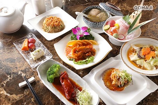 精選綜合生魚片一份 + 干燒大蝦一份 + 蔥燒子排一份 + 蔥油日本扇貝一份 + 加拿大鮭魚炒飯一份 + 枸杞雞塊湯一份 + 古早味炒高麗一份 + 主廚特製甜點一份 + 時令新鮮水果一份
