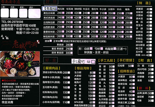 近大潤發安平店!說到老城門洞重慶火鍋的湯頭,都讓饕客們眼睛一亮、讚不絕口!能有如此強大的魅力就在於老闆遠赴重慶費時一年向老師傅學習鍋物製程!天然熬煮湯底、新鮮嚴選食材,不沾醬直接品嚐,富饒層次、濃香順口!全方位的嚴格要求、高品質的堅持,就是要讓您食得安心、健康!極品鍋物的絕佳魅力,此生非嚐不可!