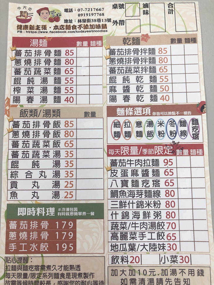 位於高雄市苓雅區的〝今天吃麵 番茄排骨(文化店)〞,主打平價的健康麵食,堅持選用新鮮食材,店內麵食皆不添加味精,給您最自然醇郁的好味道!招牌菜色蕃茄排骨麵更是首訪必點,湯頭底蘊嚐得到天然的鮮蔬甜味,並加入馬鈴薯與洋蔥加厚湯底,無論是食材品質、料理風味與麵條嚼勁都是一級棒,還有更多美味麵食等您品嚐,保證讓您一試成主顧!