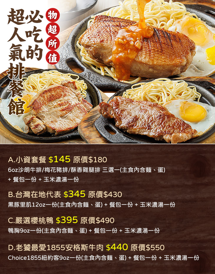 必吃的超人氣排餐館!堅持選用高規格的新鮮肉品,嚴格控管食材品質,秉持著職人精神、悉心料理每一個步驟,講究細節、追求完美,致力於讓顧客能享用到肉品本身最純粹的鮮美與甜味,此次聯合推出超值優惠套餐任君挑選,牛、豬、雞、鴨一應俱全,優秀的品質一試便知,期盼用最平價的美味帶給您最非凡的饗宴~心動不如馬上行動,速速前往購買、帶回家大吃一波,盡情享用物超所值的豐盛排餐!