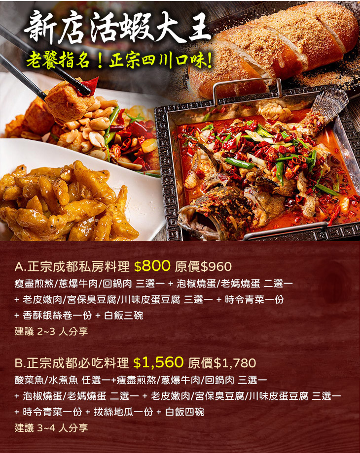 主打川菜與頂新鮮的海鮮美食,正宗四川味,從食材到調味都遵循四川在地的作法,將川菜的原味忠實呈現,也能配合客人的喜好調整辣度,不論是符合台灣人味蕾的一般辣度,或是道地的四川香辣,貼心滿足您的口腹之慾!此外,招牌必嚐的泰國蝦料理,更揀選了碩大肥美的蝦隻為您料理,讓您用滿滿的鮮甜,配上香麻開胃的川菜,搭配出超豪華、讓人大飽口福的宴席,給您至高無上的味覺饗宴!