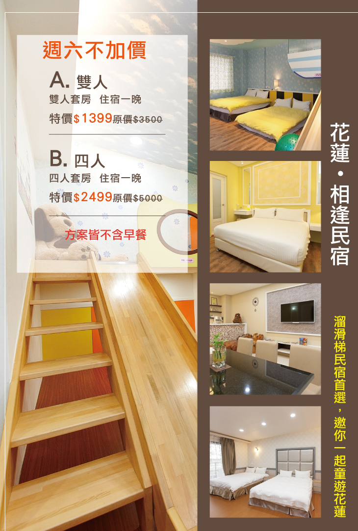 在溫暖陽光下感受愜意,在寧靜氛圍裡探索自然,簡單、美好即是最幸福的時光!現在就安排一趟花蓮輕旅行!讓你卸下不愉快與生活中累積的壓力,親子共創充滿歡樂笑聲的旅行回憶,讓幸福不再只是一種憧憬!步行即可達花蓮火車站,交通超方便!