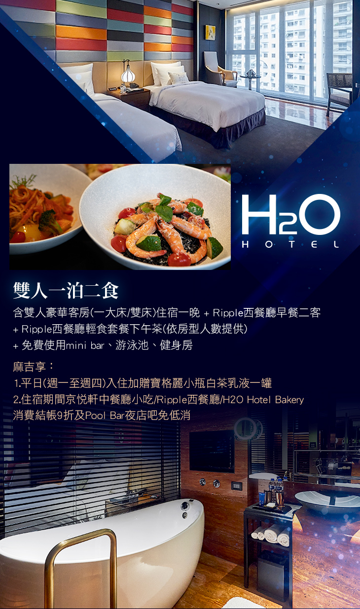 ★ CP值超高!麻吉享:1.平日(週一至週四)入住加贈寶格麗小瓶白茶乳液一罐、2.住宿期間京悅軒中餐廳小吃/Ripple西餐廳/H2O Hotel Bakery消費結帳9折及Pool Bar夜店吧免低消