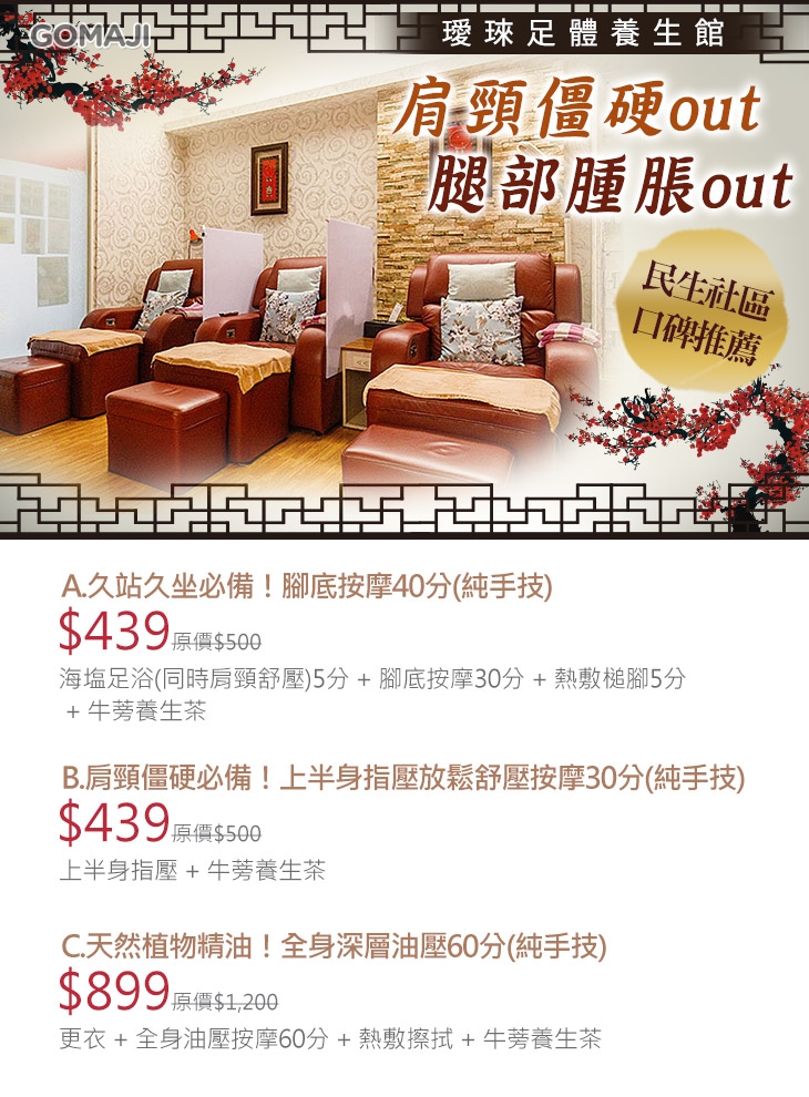 A.久站久坐必備!腳底按摩40分(純手技) / B.肩頸僵硬必備!上半身指壓放鬆舒壓按摩30分(純手技) / C.天然植物精油!全身深層油壓60分(純手技)
